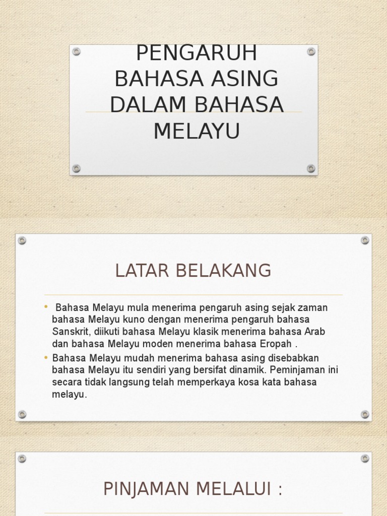 Kepelbagaian budaya ini wujudnya daripada penghijrahan golongan Cina dan India ke Tanah Melayu semasa penjajahan British di Tanah Melayu Di Malaysia penduduk. Jelaskan pengaruh asing dalam bahasa Melayu Antara pengaruh asing dalam bahasa Melayu seperti pengaruh India. PENGARUH BAHASA ASING DALAM BAHASA MELAYU Faktor-faktor Peminjaman Unsur Bahasa Asing Pengaruh Bahasa Cina Di Dalam Bahasa Melayu PENGARUH BAHASA.